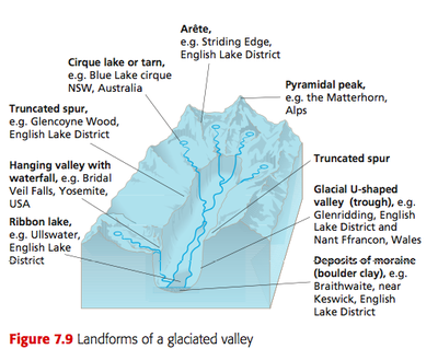 i. Explain the advance and retreat of glaciers and the main features resulting from the processes of erosion and deposition by glaciers.